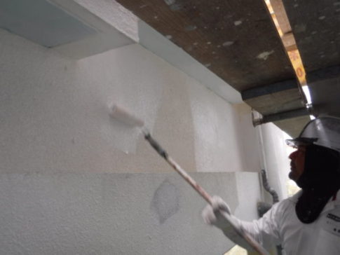 現場親方ブログ2019年5月17日 おはようございます。當真様邸の作業内容報告です。 今日の作業は駐車場の軒塗装を行いました。 【塗料剥がれ防止に密着剤を塗布します。】 【無機塗料(1回目)塗布】