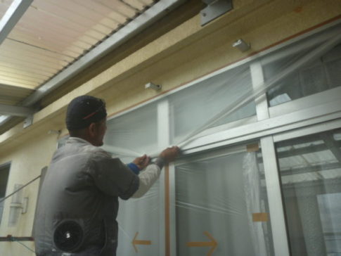 現場親方ブログ2019年5月28日 おはようございます。玉城様邸の作業内容を報告します。 今日の作業は養生を行いました。 【ペンキの汚れがつかないように窓廻り等をビニールで覆います。】