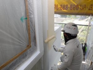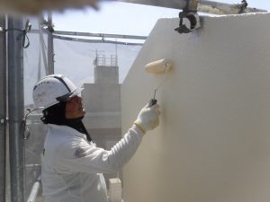 現場親方ブログ2019年5月24日 おはようございます。又吉様邸の作業内容報告です。 今日の作業は、外壁仕上げ塗装、お風呂場壁面のシーラー(密着剤)塗布を行いました。 【無機塗料(2回目)仕上げ塗り】 【シーラー(密着剤)塗布】