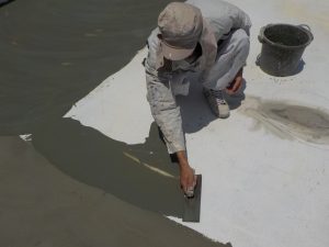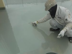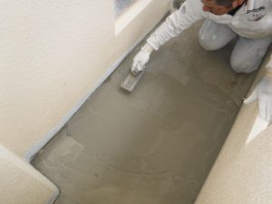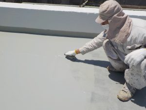 現場親方ブログ2019年6月1日 おはようございます。當真様邸の作業内容報告です。 今日の作業は昨日に引き続き、屋上・ベランダ防水材(2回目)塗布です。 【ウレタン防水材に厚みをつけるため左官コテで塗布します。】