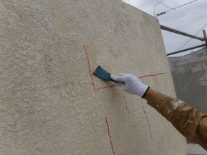 現場親方ブログ2019年6月5日 おはようございます。玉城様邸の作業内容報告です。 今日の作業内容は模様付けを行いました。 【補修箇所が目立たないようにブツブツの模様を付けます。】