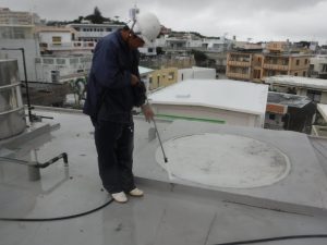 現場親方ブログ2019年6月4日 いつもブログ拝見ありがとうございます。 今日から新しい現場がスタートしました。屋上遮熱防水工事です。 作業初日は高圧水洗浄を行いました。 【高圧水洗浄機で屋上土間の汚れをきれいに洗い流します。】