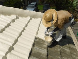 現場親方ブログ2019年5月22日 おはようございます。又吉様邸の作業内容報告です。 今日の作業は、瓦屋根のポイント塗装と外壁の下塗り塗装を行いました。 【瓦屋根ポイント塗装】
