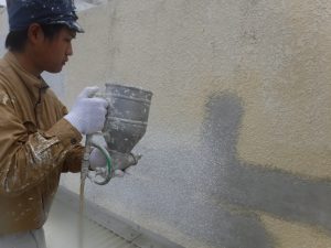 現場親方ブログ2019年5月22日 おはようございます。當真様邸の作業内容報告です。 今日の作業は外壁の模様付けと下塗り塗装を行いました。 【補修箇所が目立たないようにブツブツの模様を付けます。】 【下塗り塗装】