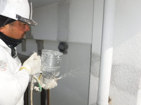 現場親方ブログ2019年5月24日 おはようございます。當真様邸の作業内容を報告します。 今日の作業は、外壁中塗り塗装を行いました。 【無機塗料(1回目)塗布】