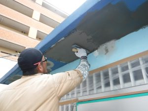 現場親方ブログ2019年5月24日 おはようございます。當真様邸の作業内容報告いたします。 今日の作業は昨日に引き続き、下塗り塗装を行いました。 【塗料剥がれ防止に密着剤を塗布します。】
