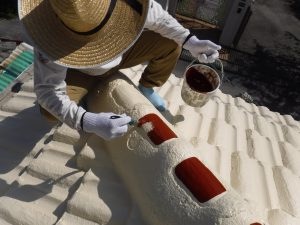 現場親方ブログ2019年5月22日 おはようございます。又吉様邸の作業内容報告です。 今日の作業は、瓦屋根の仕上げ塗装と外壁の模様付けを行いました。 【瓦仕上げ塗装】 【補修箇所が目立たないようにブツブツの模様を付けます。】
