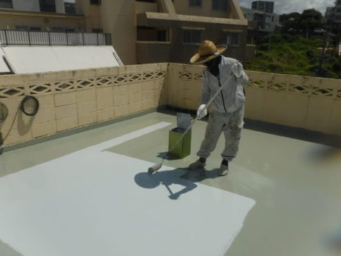 現場親方ブログ2020年9月19日 おはようございます。外間様邸の作業内容報告です。 今日の作業は、屋上・ベランダ防水材塗布を行いました。 【防水材(1回目)塗布】