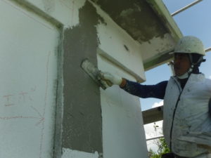 現場親方ブログ2020年9月4日 おはようございます。外間様邸の作業内容報告です。 今日の作業は、外壁補修を行いました。 【ひび割れ箇所、はつり箇所の左官仕上げ】