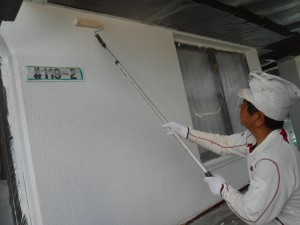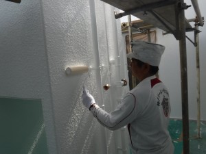 現場親方ブログ2017年5月14日 下塗りにまず水性塗料を塗っていきます。中塗り塗装からは、弱溶剤塗料をぬっていきます。