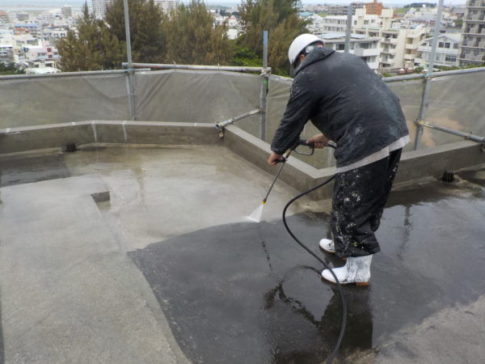 現場親方ブログ2017年5月22日 いつもブログ拝見していただきありがとうございます。 本日から知念様宅の屋上・階段・廊下防水工事がはじまりました。 初日は高圧水洗浄からです。屋上・階段・廊下の汚れをきれいに洗い流していきます。