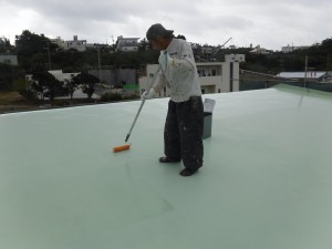 現場親方ブログ2017年4月12日 本日の作業は屋上遮熱材仕上げ塗りです。 ウレタン防水材を保護する役目と、室内の温度を軽減させるため、遮熱材を塗り仕上げます。