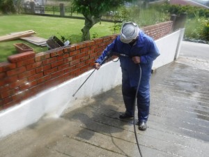 現場親方ブログ2017年5月1日 赤嶺様宅にて外壁改修、塗装、防水工事がスタートしました! 初日は高圧洗浄からやっていきます。屋上、ベランダ、壁、ブロック塀など隅々までキレイにコケや汚れを落とします。