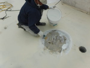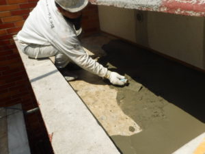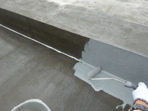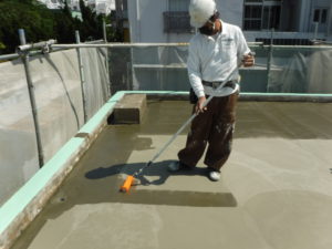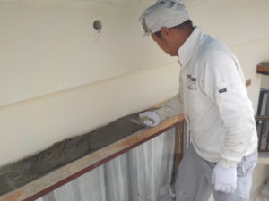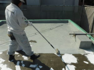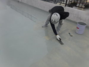 現場親方ブログ2020年4月7日 おはようございます。座波様邸の作業内容報告です。 今日の作業は防水材(2回目)塗布を行いました。 【防水材に厚みをつけるため、左官コテで塗布します。】