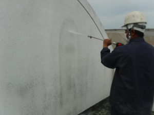 現場親方ブログ2020年4月3日 いつもブログ拝見ありがとうございます。 今日から新しい現場がスタートしました。屋上遮熱防水工事です。 作業初日は水洗いを行いました。 【高圧水洗浄機で屋上の汚れをきれいに洗い流します。】