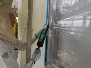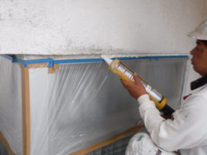 現場親方ブログ2020年4月12日 おはようございます。新城様邸の作業内容報告です。 今日の作業は窓廻りコーキング打ち替えを行いました。 【コーキング剥がれ防止に密着剤を塗布します。】 【窓廻りコーキング打ち】