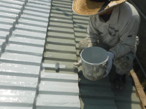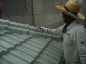 現場親方ブログ2020年4月3日 おはようございます。山城様邸の作業内容を報告します。 今日の作業は、前回に引き続き瓦全面防水材(2回目)塗布です。 【防水材(2回目)塗布】