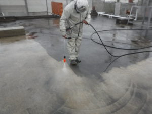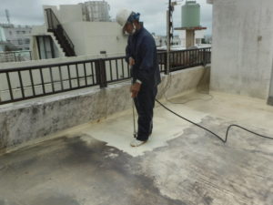 現場親方ブログ2020年4月22日 いつもブログ拝見ありがとうございます。 今日から新しい現場がスタートしました。屋上遮熱防水工事です。 作業初日は洗浄を行いました。 【高圧水洗浄機で屋上土間の汚れをきれいに洗い流します。】