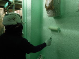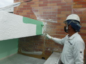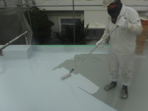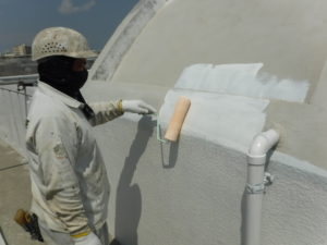 現場親方ブログ2020年4月6日 おはようございます。座波様邸の作業内容報告です。 水洗い後の作業は、防水材塗布を行いました。 【防水材剥がれ防止に密着剤を塗布します。】 【雨漏り防止に防水材(1回目)を塗布します。】