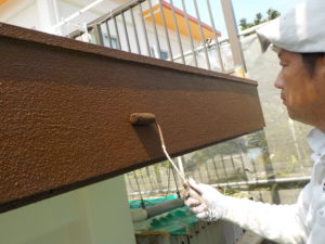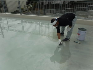 2020年5月8日 おはようございます。當間様邸の作業内容を報告します。 今日の作業内容は屋上防水、木部塗装を行いました。 【防水材剥がれ防止にプライマー(密着剤)を塗布します。】