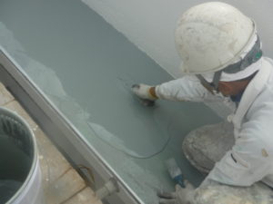 現場親方ブログ2019年7月23日 おはようございます。宮城様邸の作業内容報告です。 今日の作業は、屋上・ベランダ防水材(2回目)塗布です。 【防水材に厚みをつけるために左官コテで塗布します。】