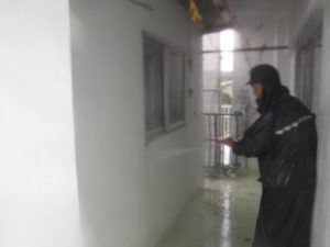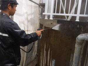 現場親方ブログ2019年8月5日 いつもブログ拝見ありがとうございます。今日から新しい現場がスタートしました。 外壁改修・塗装・防水工事です。作業初日は建物の水洗いから行います。 【高圧水洗浄機で外壁の汚れをきれいに洗い流します。】
