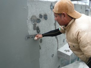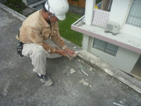 現場親方ブログ2019年11月15日 おはようございます。新垣様邸の作業内容報告です。 前回の建物洗浄後の作業は、外壁の補修作業を行いました。 【外壁、土間のコンクリート劣化箇所をはつります。】 【鉄筋サビ止め材塗布】 【セメント剥が...