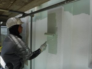 現場親方ブログ2019年7月15日 おはようございます。宮城様邸の作業内容を報告します。 今日の作業内容は下塗り塗装を行いました。 【無機塗料剥がれ防止に密着剤を塗布します。】