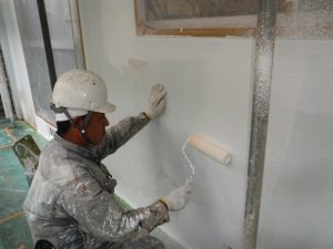 現場親方ブログ2019年12月2日 おはようございます。新垣様邸の作業内容報告します。 今日の作業は防水2回目と木部塗装を行いました。 【防水材に厚みをつけるため左官コテで塗布します。】 【木部塗装】