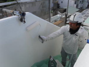 現場親方ブログ2019年7月24日 おはようございます。宮城様邸の作業内容報告です。 今日の作業は、屋上・ベランダ遮熱材塗装を行いました。 【防水材を保護する役目と室内の温度を軽減するために遮熱材を塗布します。】