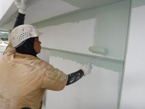 現場親方ブログ2019年7月17日 おはようございます。宮城様邸の作業内容報告です。 今日の作業は前回に引き続き、中塗り塗装と鉄部塗装を行いました。 【無機塗料(1回目)塗布】